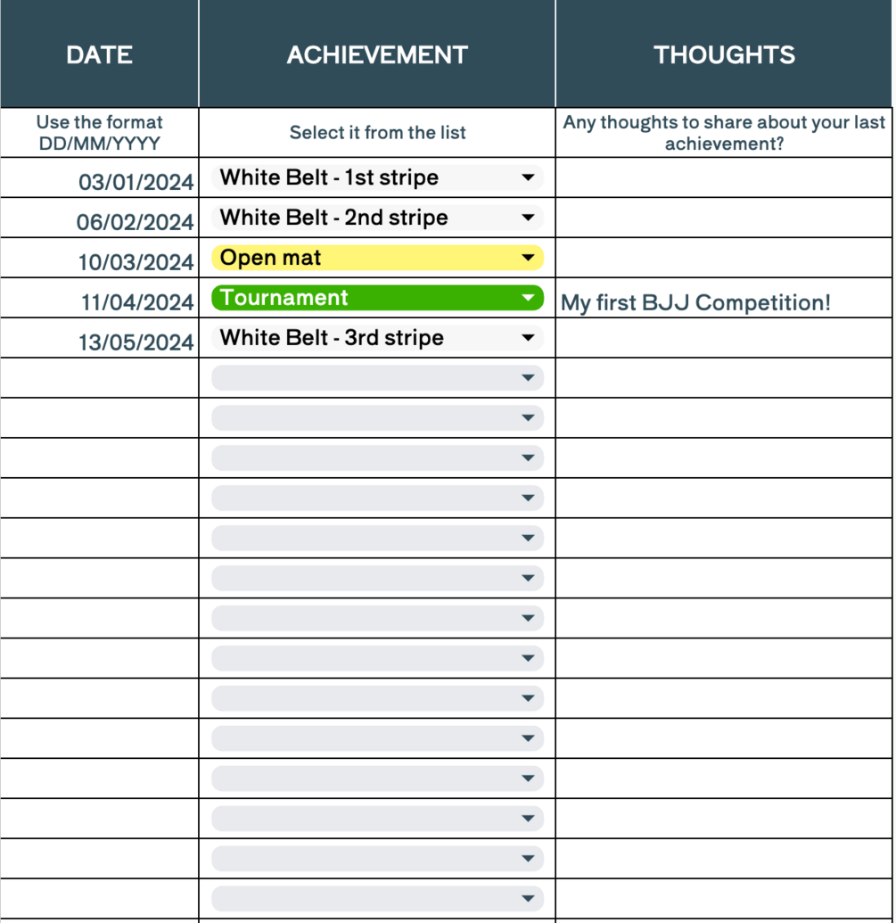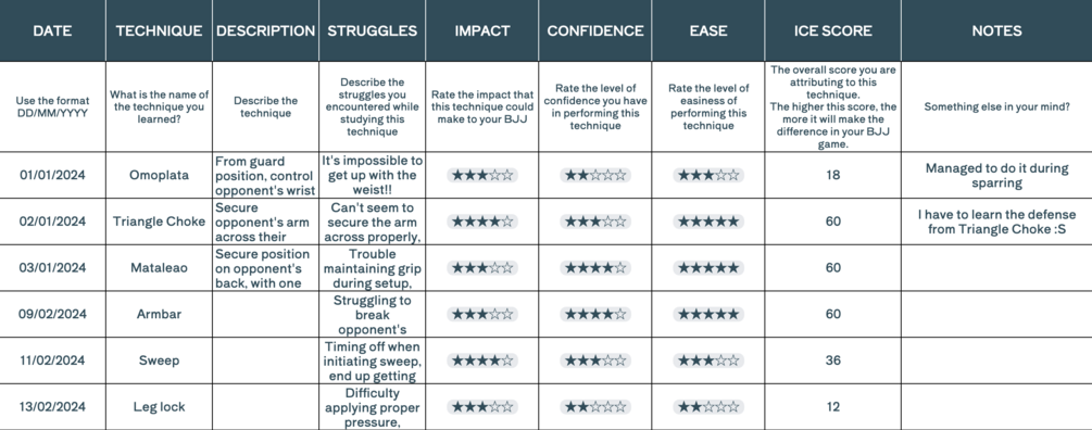 Imagine having a companion by your side throughout your BJJ journey, guiding you, tracking your progress, and celebrating your growth. That's exactly what our BJJ Training Journal on Google Sheets offers.